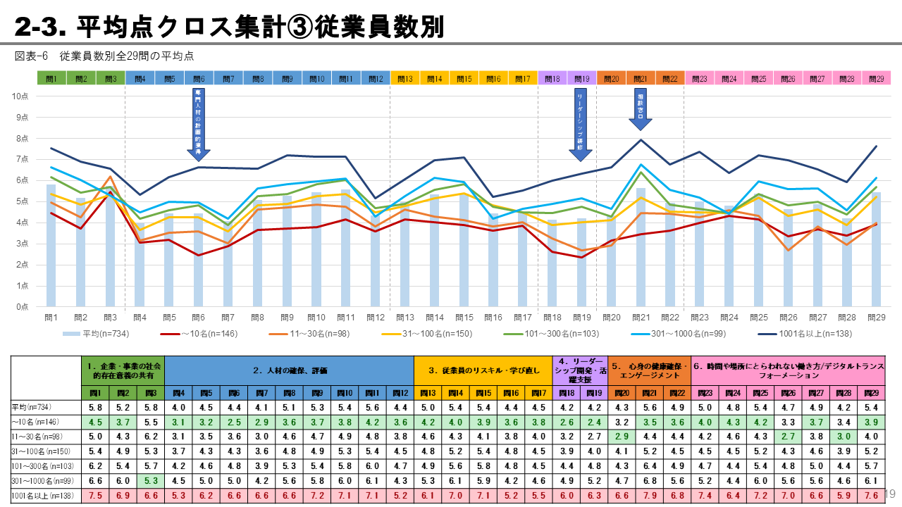 企業規模:従業員数が多くなるほどスコアが高い傾向が顕著です。特に「1001名以上」の組織と、1000名以下の組織との平均スコア差が昨年より0.6拡大しました。