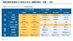 また、制度は⼀度作ったら完成、という考えも捨てました。かつてのサイボウズのテレワークのルールブックは、制約を意味する 「オレンジ⾊」のルールで埋め尽くされていました。⽉4回の回数制限、事前承認の徹底……。しかし、社員が⾃律し、オンラインでのコミュニケーションに習熟するにつれて、これらの管理のためのルールをどんどん削ぎ落としてきました。 現場からの「質問責任」による突き上げに真摯に⽿を傾け、不都合があればやり方を変えてやってみる。この柔軟なプロセスそのものが、制度を形骸化させないためのこだわりです。現在は「スケジュールの登録」という最⼩限のルールを除き、多くが社員の裁量に委ねられています。信じて任せる、ただし情報は全てオープンにする。このバランスを極めることが、組織運営の真髄となっています。