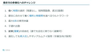 これからテレワークや組織改⾰に取り組もうとしている皆さんに、お伝えするとしたら、働き⽅改⾰を「法律で決まったから、国に⾔われたから守らなければならない義務」と捉えると、現場は必ず疲弊します。そうではなく、⾃社が掲げる理想やパーパスを実現するために、最も効率的で、最もメンバーが⼒を発揮できる⼿段は何なのか。その問いの先にこそ、本当の改⾰があります。まずは、⽬の前の⼀⼈ひとりと丁寧に向き合うことから始めてみるのはいかがでしょうか。最初から100点満点の完璧な制度を⽬指す必要はありません。⼤切なのは、情報をオープンにすること。そして、現場から上がる「なぜ︖」という質問に対し、経営側が誠実に、論理的に答え続けることです。