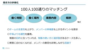 同社のユニークな戦略の⼀つが、画⼀的な制度ではなく、深い対話に基づいた「100⼈100通りのマッチング」という考え⽅。社員が望む働き方と、会社が求める役割を1対1で擦り合わせ、働く時間・場所、さらには報酬までも個別に決定するシステムです。
