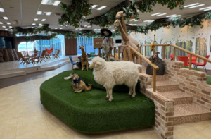 (写真左上:オフィスエントランス 右上:子供連れで利用できる会議室 他、ファミレスのような家具などユニークな空間が溢れている)