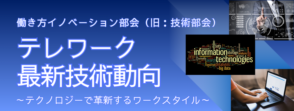 働き方イノベーション部会(旧称:テレワーク最新技術動向研究部会)は、テレワークの課題解決を支援する技術やツールの最新動向について、ユーザーとベンダー双方の視点から発表・議論を行い、テレワークの定着と進化を目指して活動しています。本コンテンツでは、テレワーク最新技術動向(各年度の部会活動内容)をご紹介し、皆さまのテレワーク推進や働き方DX促進の参考にしていただければ幸いです。